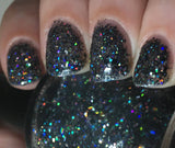 Kneel Before Zod is an intense, incredibly sparkly black holographic glitter bomb, with black and grey holographic glitters in a range of sizes. Full glitter coverage in 2-3 coats, or wear 1 coat over another base color.
